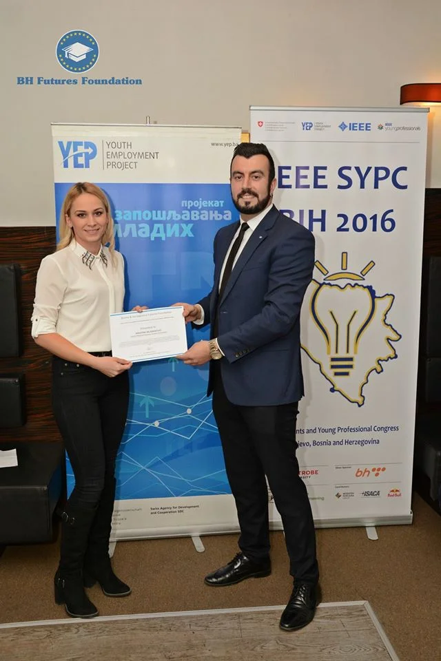 Kristina Mladjenovic received a Bosnia & Herzegovina Futures Foundation 12 month scholarship to study mechanical engineering at the University of East Sarajevo. The scholarship was presented to Kristina at the IEEE Student & Young Professional Congress, held in Sarajevo from the 1-4 of December 2016.